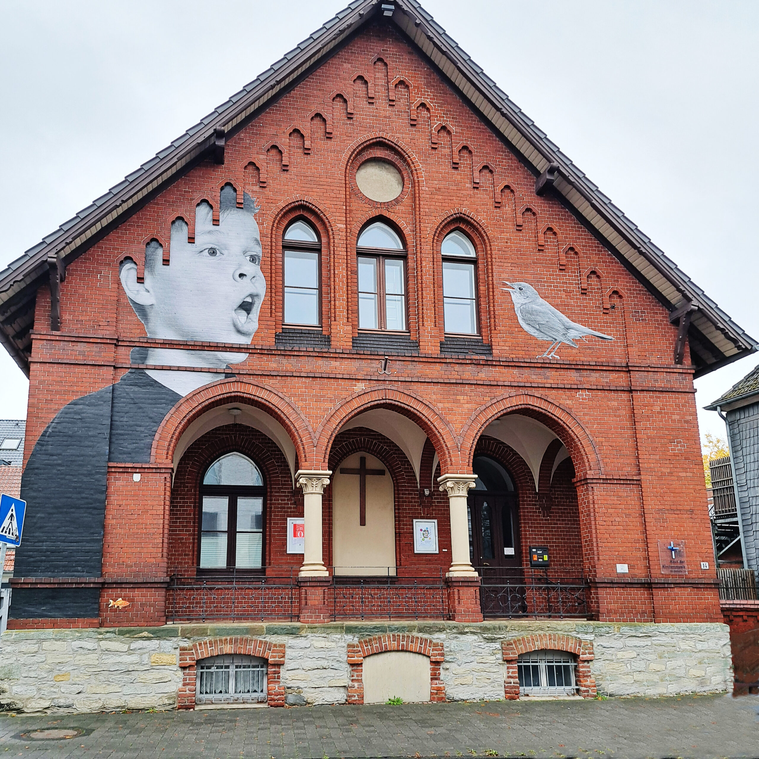 Einige Paste Ups wei­sen auf die Pflege der Musik in Güters­loh hin. Am Haus der Kir­chen­mu­sik singt ein Junge gemein­sam mit einer Nach­ti­gall. Der Bach­chor Güters­loh, die Cho­ral­sing­schule und der Kna­ben­chor unter der Lei­tung von Sig­mund Both­mann haben hier ihre Hei­mat.