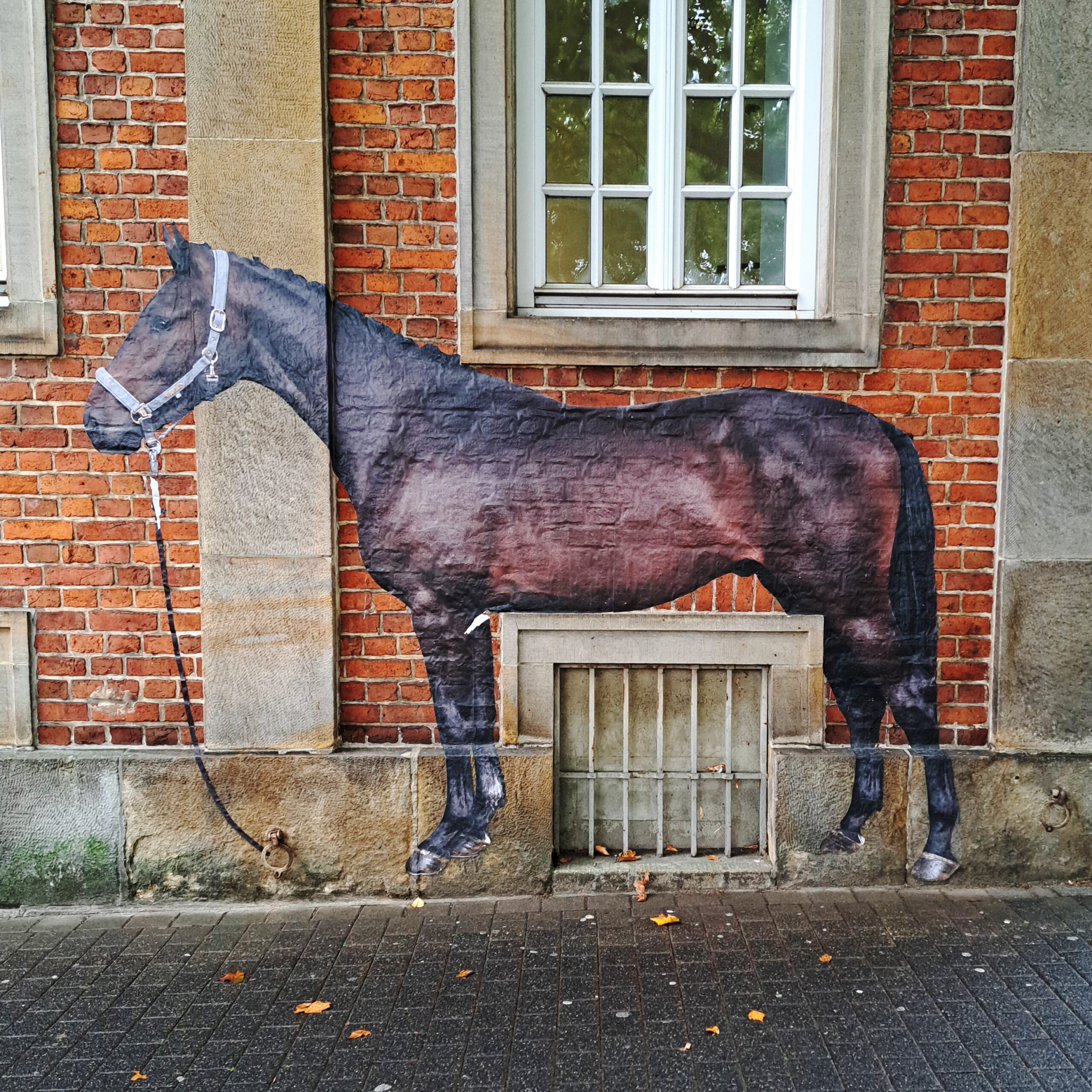Ein Pferd in Lebens­größe ist an der Fas­sade der Deut­schen Bank zu sehen. Folgt man dem Zügel, ent­deckt man his­to­ris­ti­sche Ringe, an denen frü­her Pferde ange­bun­den wur­den – ein Detail, das wohl nur weni­gen Güters­lo­he­rin­nen und Güters­lo­hern bekannt war.
