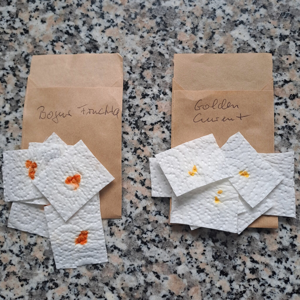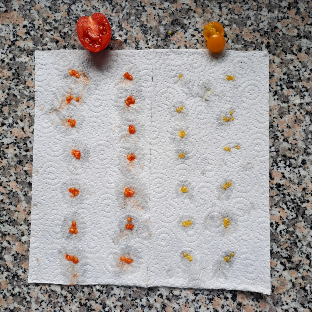 Aus rei­fen Toma­ten habe ich Samen fürs nächste Jahr gewon­nen. Gele­sen habe ich, man solle die Samen mit ihrer gal­lert­ar­ti­gen Hülle in einem Glas mit Was­ser gären las­sen, um die schlei­mig Schicht zu ent­fer­nen. Das habe ich mir erspart, in dem ich die Samen­kör­ner auf ein Küchen­krepp zu Tro­cke­nen auf­ge­bracht habe. Druch den Schleim kle­ben sie zuver­läs­sig auf dem Papier. Im Früh­jahr bringe ich dann die klei­nen Papier­stü­cke direkt auf die Anzucht­erde auf und bede­cke sie nur dünn. Das Papier zer­setzt sich rasch von selbst.