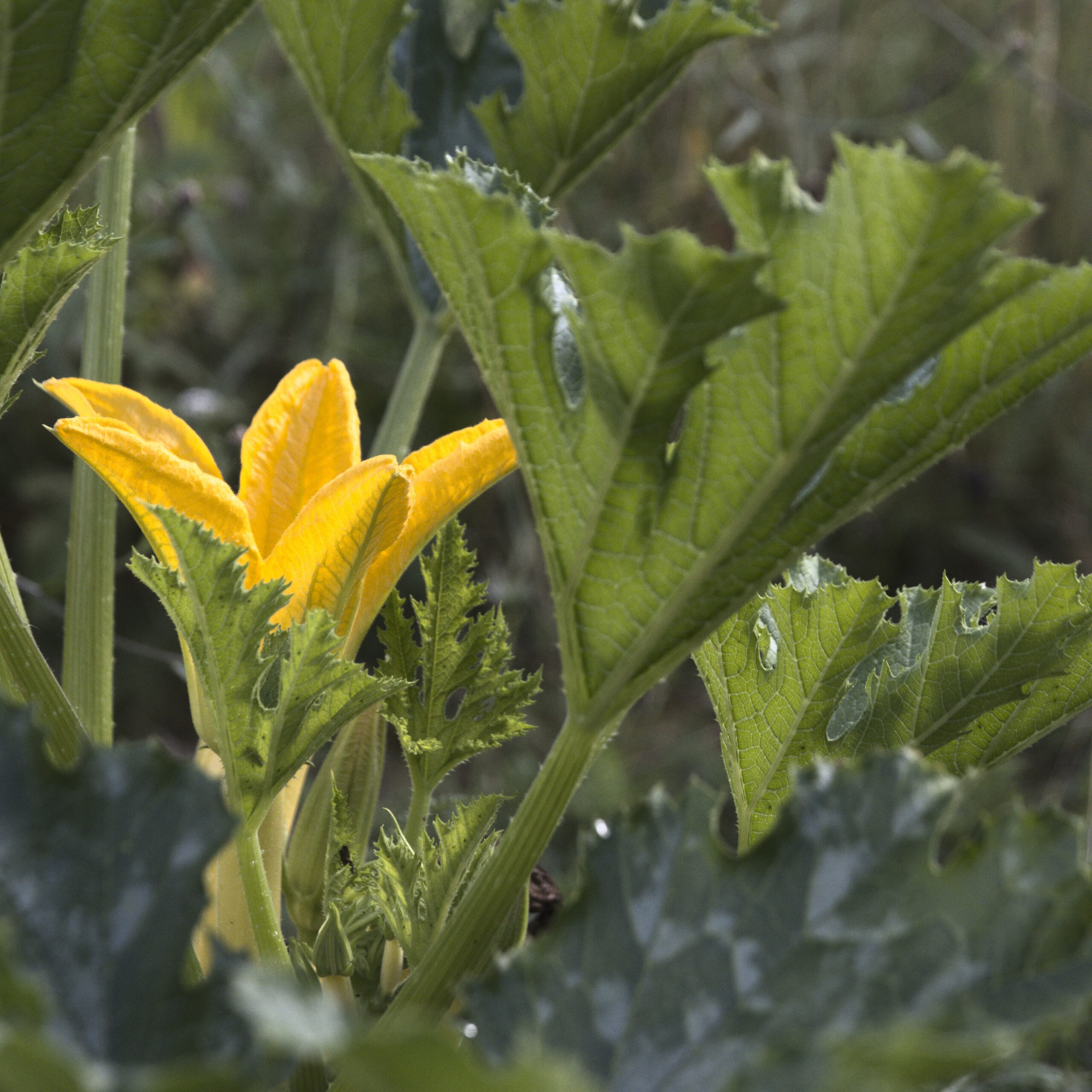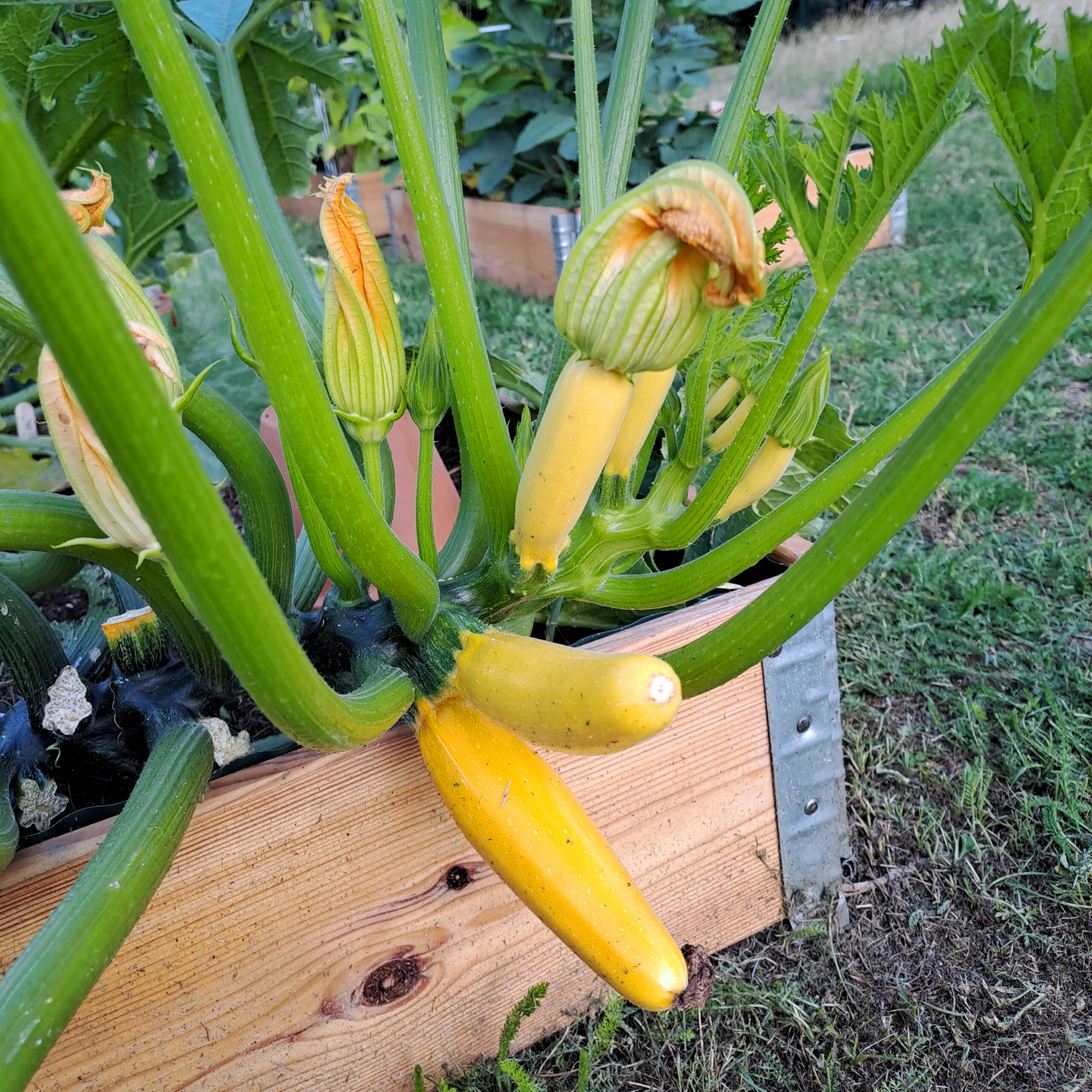 Die Pflanzen habe ich im Frühjahr im Haus vorgezogen und Mitte Mai ausgepflanzt. Damit sie so kräftig wachsen, bekommen sie regelmäßig Kompost und Pellets aus Kuhmist als Dünger. Wenn es extrem heiß wird, werden sie natürlich auch bewässert. Auf ein Rahmenbeet 80 x 120 cm gibt es dann 10 Liter Wasser.